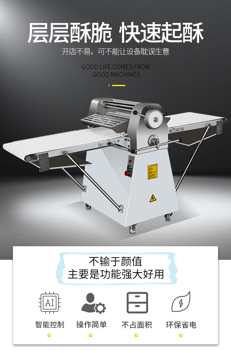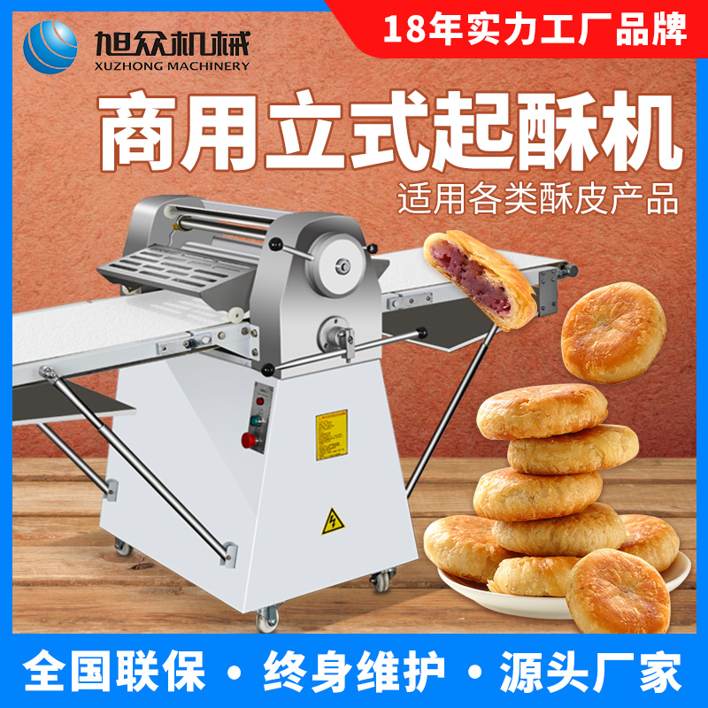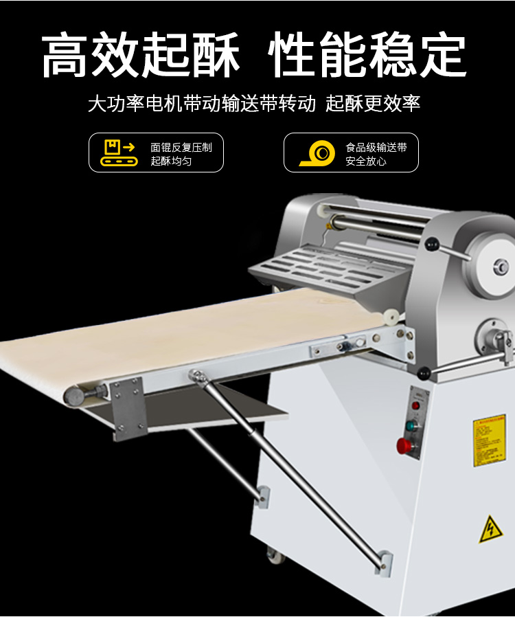 LSP-520酥皮机,采用独特的链轮传动替代了传统易磨损的塑轮传动,低噪音,高寿命滚轮经过特殊工艺处理,不粘面,不易刮伤适用于手撕面包、羊角面包、蛋挞、老婆饼、千层饼,等酥皮类食品,也可用于辗压面团。