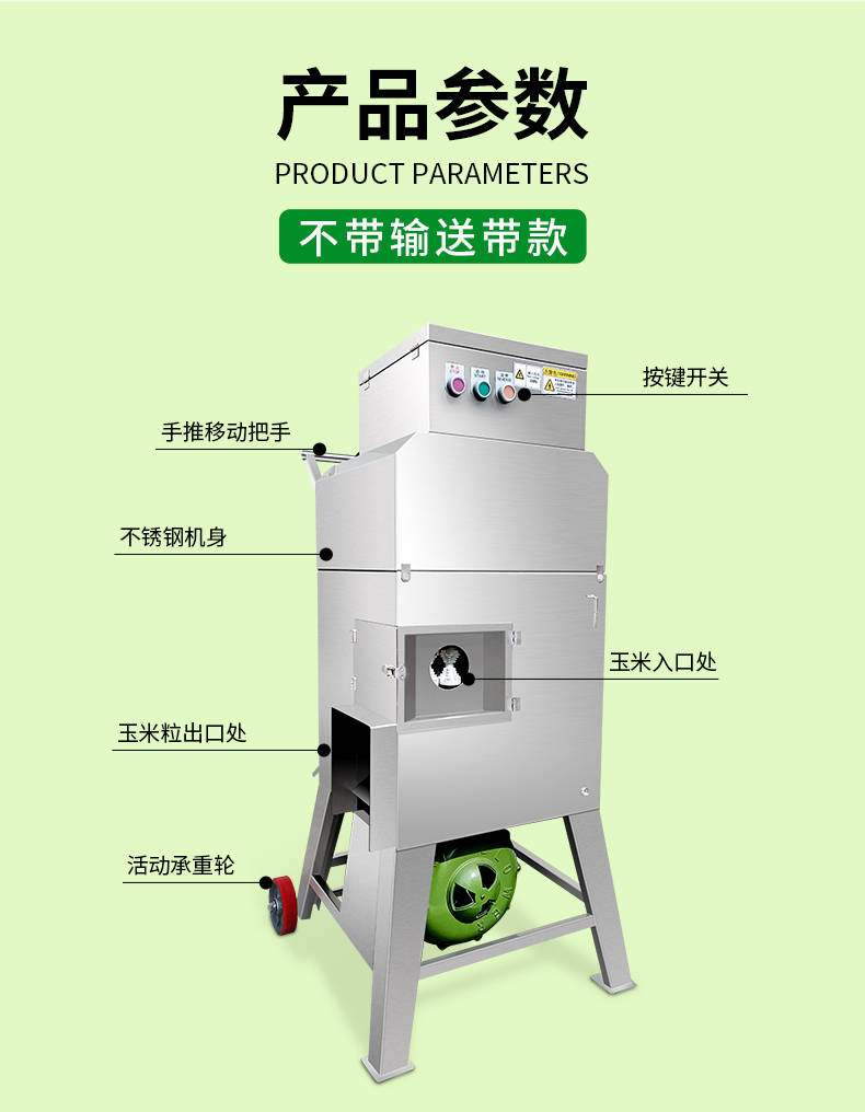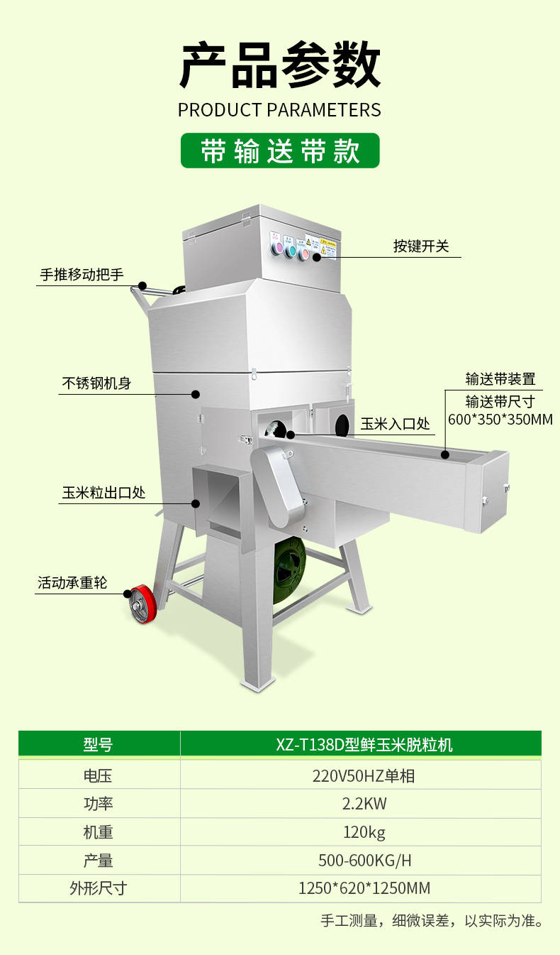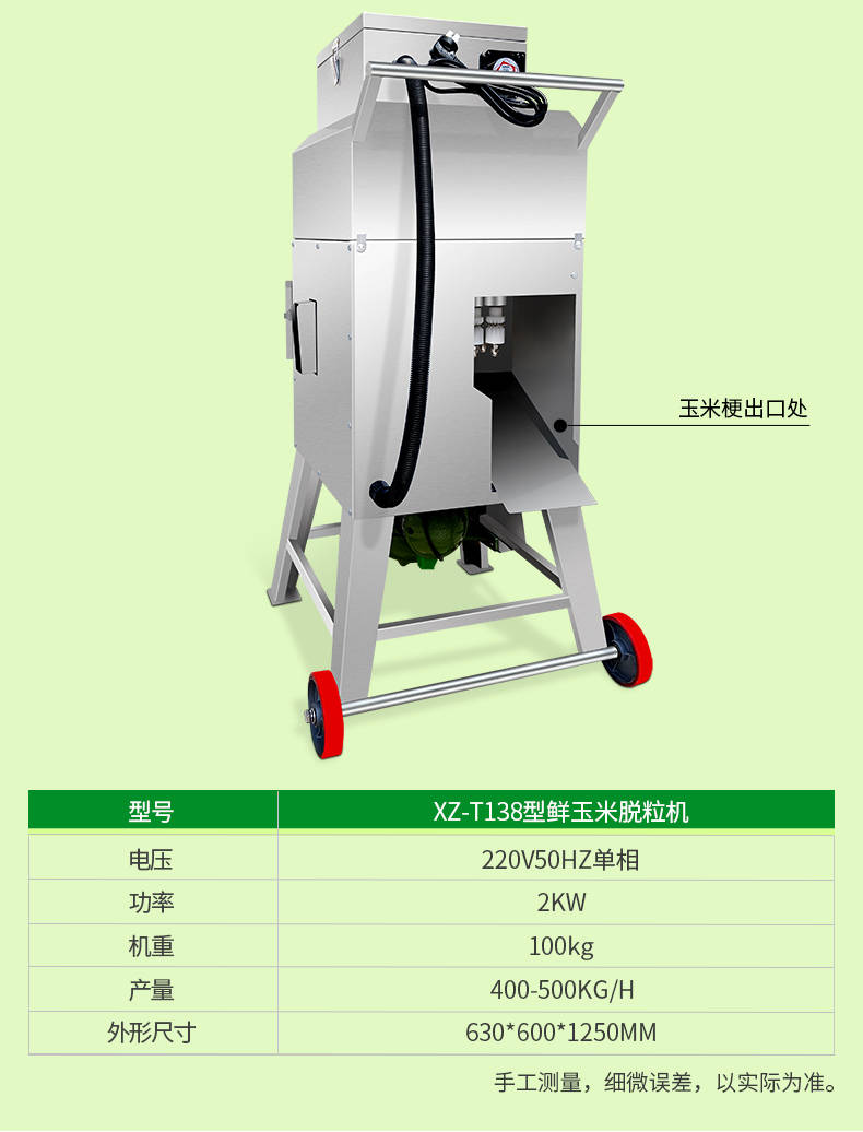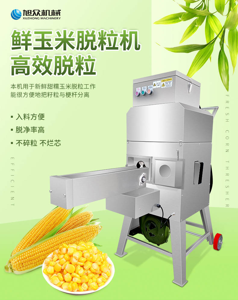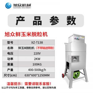 XZ-T138玉米脱粒机,鲜玉米脱粒机,高效脱粒。用于新鲜甜糯玉米脱粒工作,能很方便地把籽粒与梗杆分离。入料方便、脱净率高、不碎粒不烂芯。每分钟处理75个玉米穗。高效脱粒,满足商用,籽粒产量约为500-600Kg/h