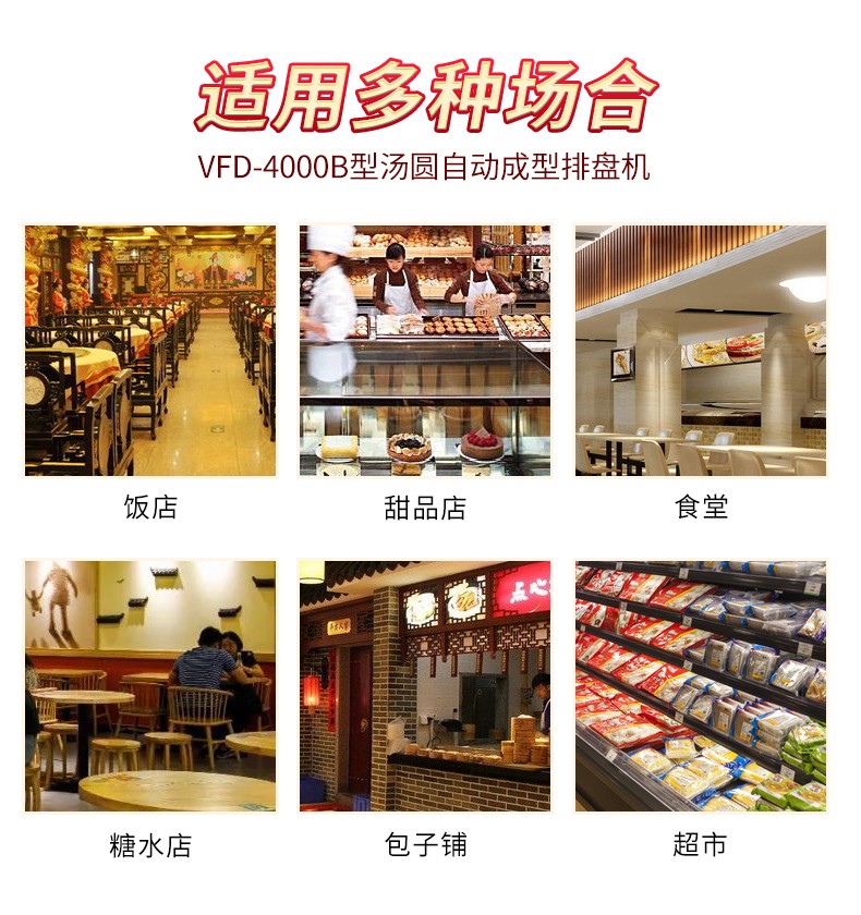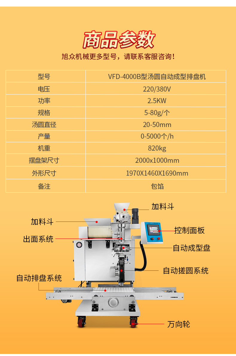 今天给大家介绍一下这款VFD-4000B型汤圆机,为什么要介绍它呢,这款机械制作多品种食品,关键是产量效率高,1小时的产量可达5000个,相当于20-30个工人同时手工制作汤圆,真正的低投入,高收益,省钱省工,可制作各式包馅食品,如汤圆、豆沙包、南瓜饼等,是宾馆、饭店、企业、学校、部队等公共食堂和专业户理想的面食机械。